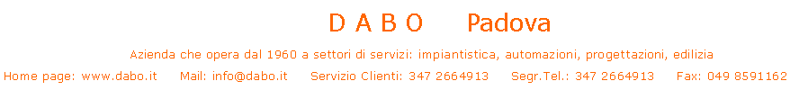 L’evoluzione tecnologica oggi rischia di travolgere tutti coloro che non possono seguirla. Nel settore telefonico questo problema sta diventando importante. La DABO progettazione e’ specializzata nell’evoluzione di impianti telefonici, che vengono mantenuti all’altezza tecnologicamente ed informaticamente. Nell’area di Padova preventivi gratuiti. |